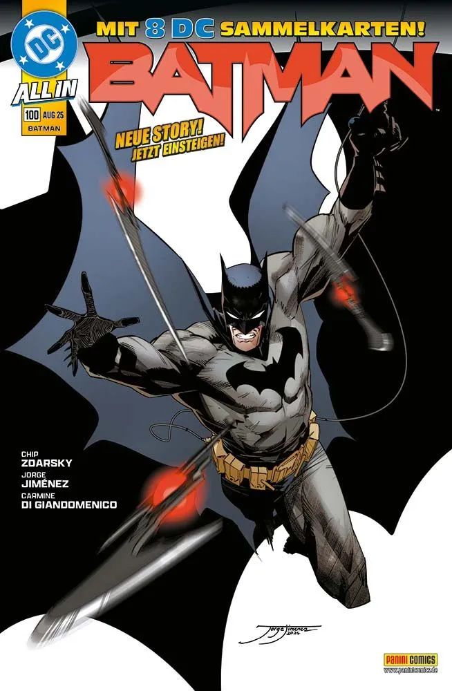 Inhalt: Zur 100. Ausgabe der Batman-Serie betritt diesedie frische, einsteigerfreundliche Ära DC All In!Eisner-Award-Gewinner Chip Zdarsky zieht indieser neuen Storyline alle Register: Bruce Waynewill Gotham mit Non-Profit-Projekten in einenbesseren Ort wandeln. Doch der Riddler, dessenKrypto-Firma NygmaTech, der intrigante Rat derEulen und der brutale neue Held Commander Starverwandeln die Stadt in ein Pulverfass. Dann wirdeine der prominentesten Personen Gothamsermordet - und selbst die jahrelange Freundschaftzwischen Batman und dem an seiner Seiteermittelnden Jim Gordon wird erschüttert...Batman 100 mit der ersten Story der neuen ÄraDC All InEin Mord erschüttert die Freundschaft vonBatman und Jim Gordon...Mit 8 DC-Trading Cards